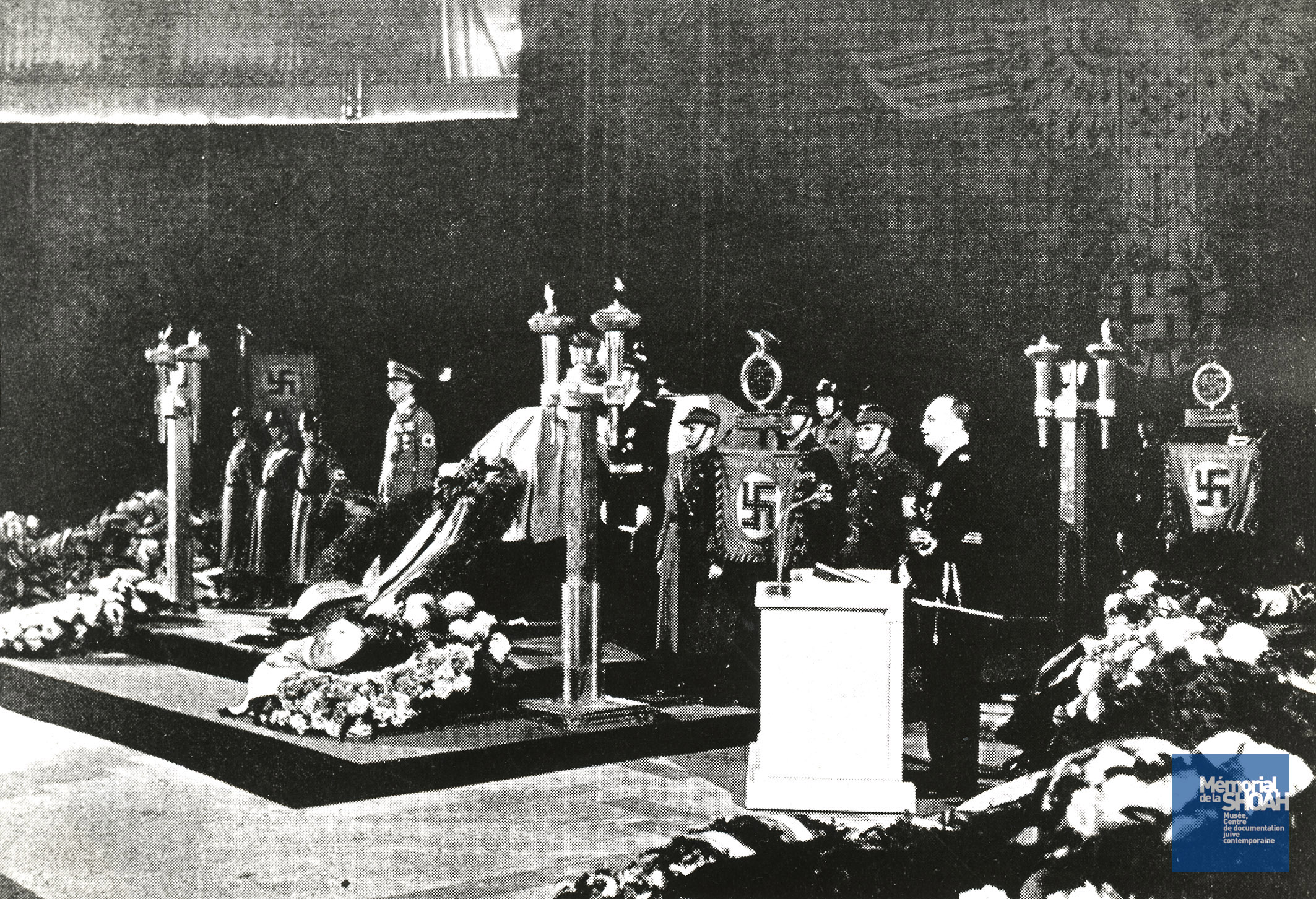 Ministre des Affaires étrangères du Reich, prononçant l’éloge funèbre lors de la cérémonie organisée à Düsseldorf pour les funérailles nationales d’Ernst Vom Rath, 16 novembre 1938.