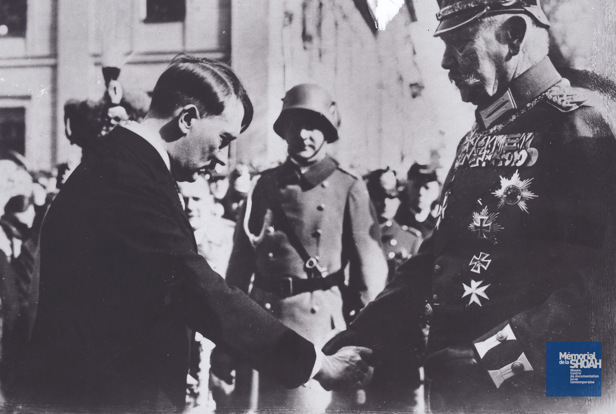 Hitler serre la main du président allemand Paul von Hindenburg, lors des cérémonies de propagande organisées par Joseph Goebbels à l’occasion de l’ouverture de la nouvelle session du Reichstag.