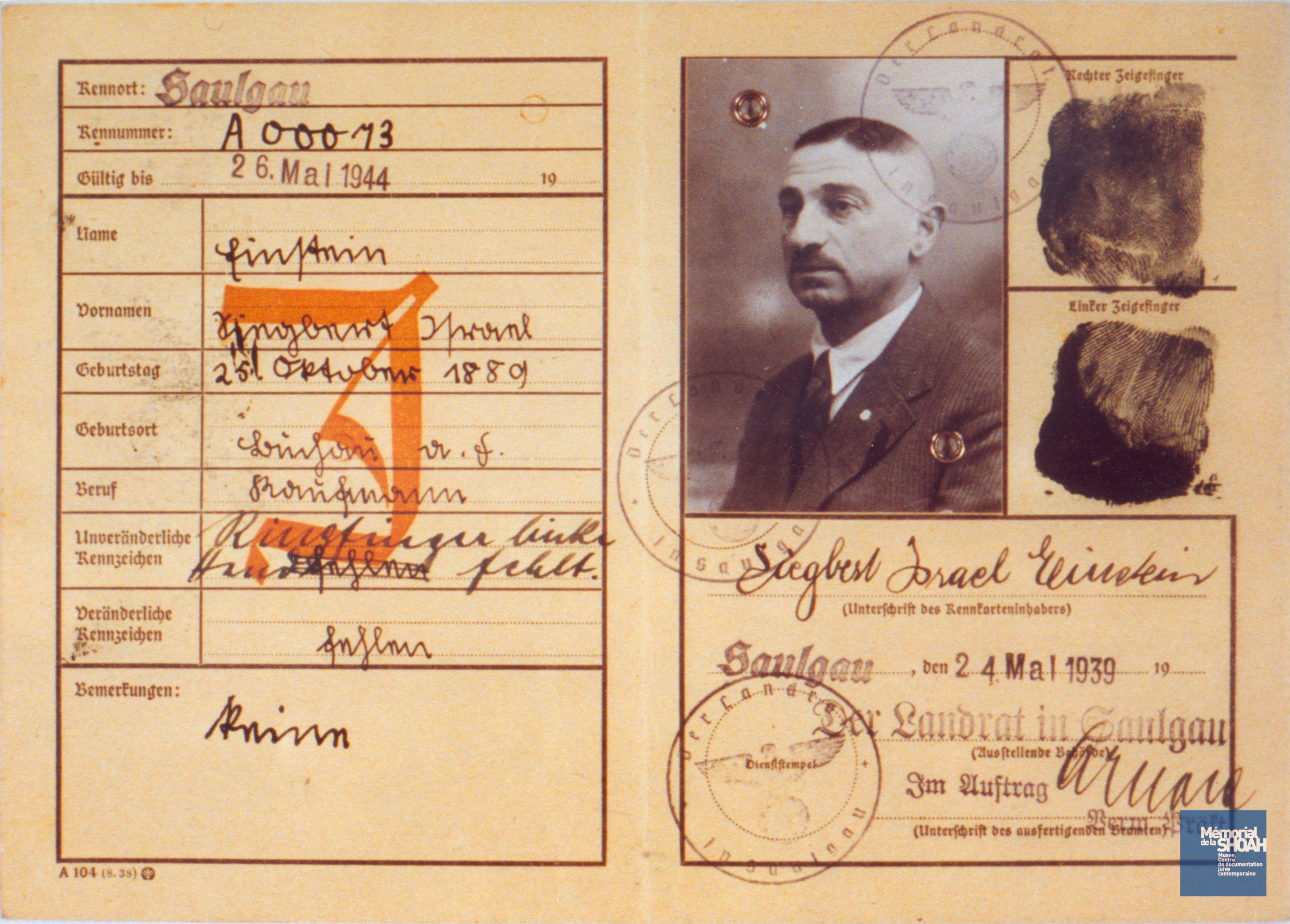 Une loi de janvier 1939 obligeait les juifs allemands à porter, sur leurs papiers d’identité, les prénoms Israël ou Sara à tous les Juifs portant des prénoms d’origine « non juive ». À partir d’octobre 1939, tous les Juifs devaient par ailleurs faire apposer la mention J sur leurs cartes d’identité et passeports.